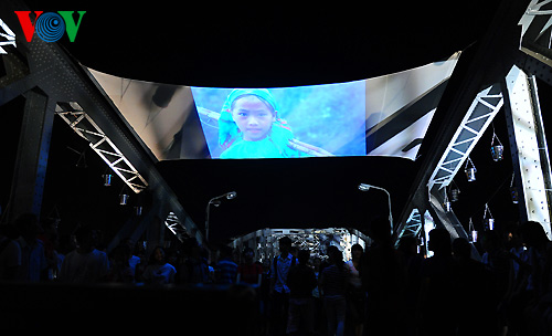 Au milieu du pont, projection d’un film sur la vie des minorités ethniques du Vietnam./. |