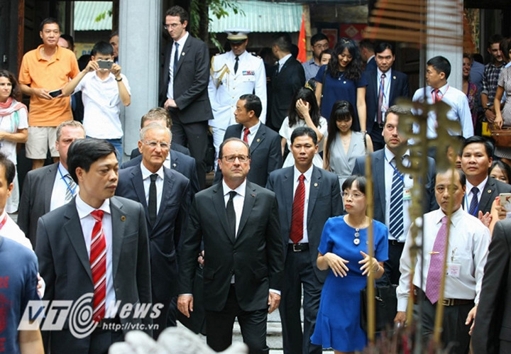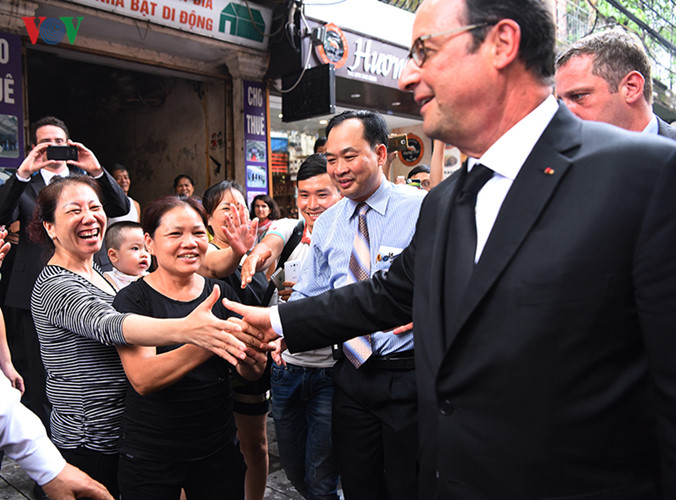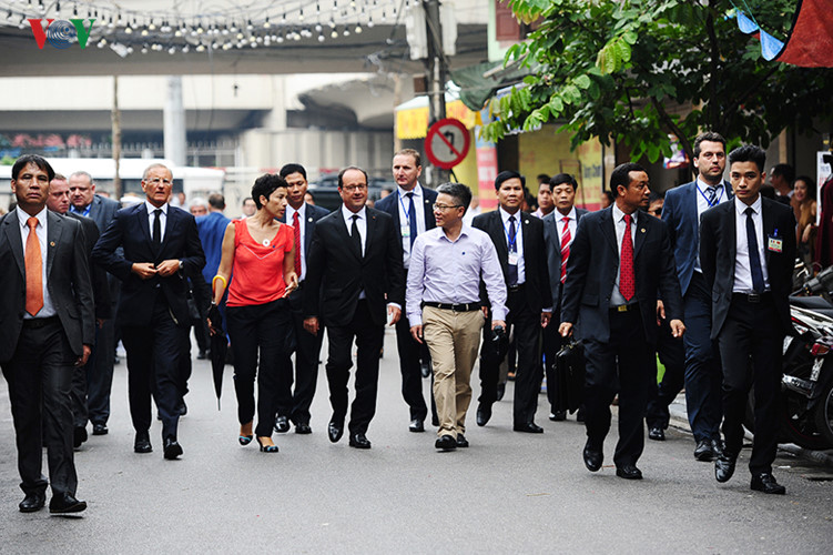 Mardi après-midi, accompagné d’anciens étudiants vietnamiens en France, dont le professeur Ngo Bao Chau, le président français s’est promené dans le vieux quartier de Hanoi (Photo : Giang Huy).