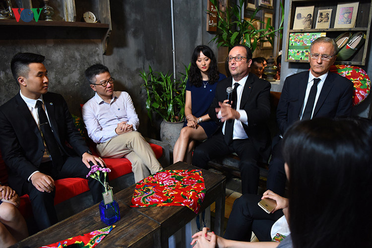François Hollande discute avec le professeur Ngo Bao Chau et certains jeunes dans un café au vieux quartier de Hanoi (Photo: Giang Huy).