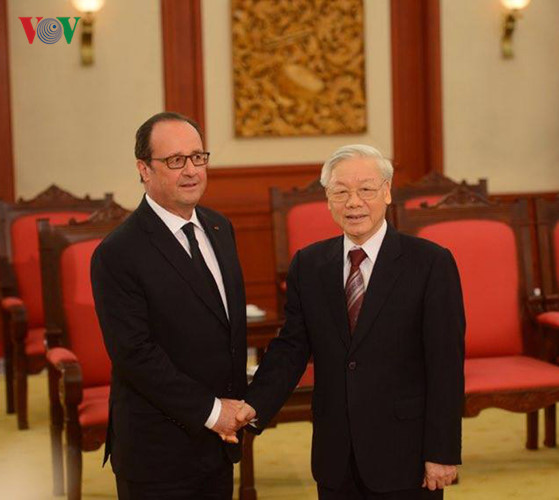 Le président français et le secrétaire général du Parti communiste vietnamien Nguyen Phu Trong. (photo: Anh Tuấn)