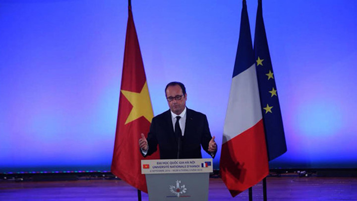 François Hollande prononce un discours à l’Université nationale de Hanoi.