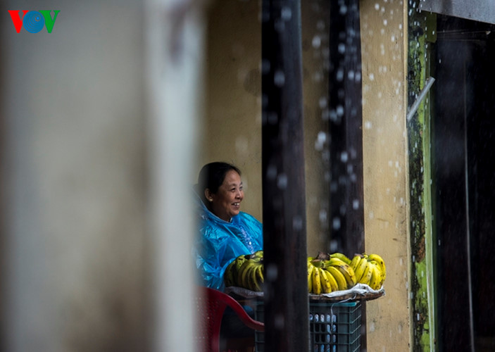 Les pluies peuvent durer toute la journée et ont pour effet de faire chuter les températures. Cette petite vieille, sur le pont Gia Hoi, est toute ratatinée.