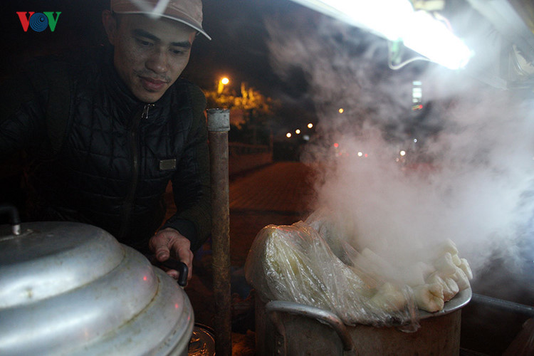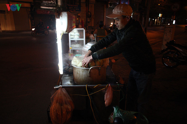 Voilà quatre ans que Tân s’est installé à Hanoï, où il vend toutes sortes de petits encas à manger sur le pouce pour gagner sa vie. Une marmite de maïs bouilli, quelques patates douces, une marmite de pains farcis cuits à la vapeur… de quoi constituer son budget familial.