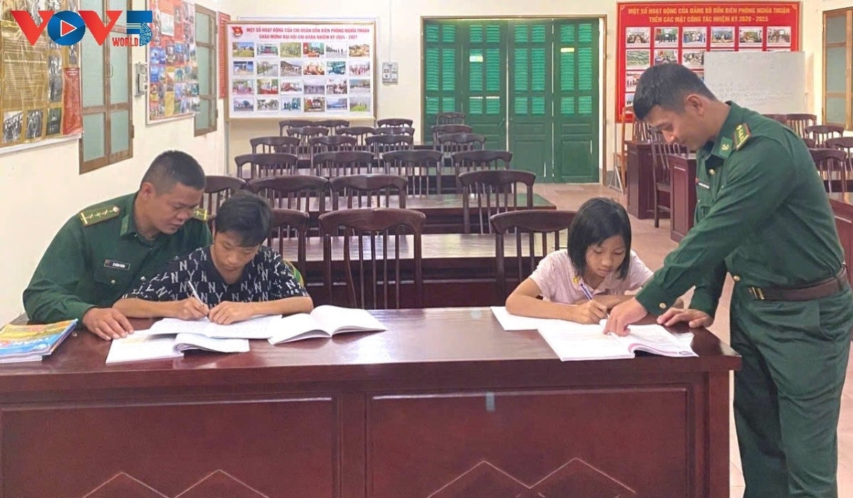 Les officiers et soldats du poste de garde-frontière de Nghia Thuân révisent les leçons avec les élèves après la classe. Photo: Vinh Phong/VOV5