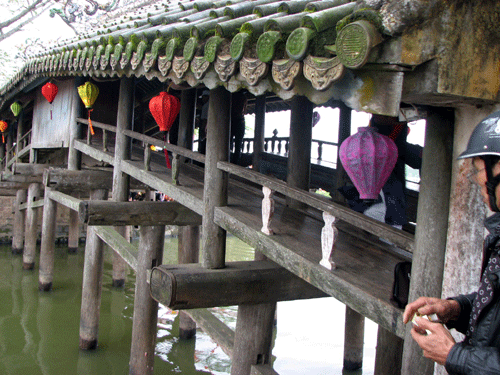 Edifié en 1776, le pont enjambe un canal d’irrigation s’étendant de l’entrée jusqu’à la fin du village de Thanh Thuỷ. Sur ses deux côtés, sont disposées des banquettes pour permettre aux promeneurs de prendre un peu de repos. 18 piliers de bois et de fer soutiennent l’ouvrage, qui, bien que très solide, subit constamment les aléas du climat et du temps. Les inondations en 1844 puis le typhon en 1904 ont presque totalement détruit cet ouvrage. Après chaque épreuve, il a été reconstruit. De l’autre côté du pont, se trouve une salle d’exposition où sont présentés divers outils agricoles: charrue, herse, faucille, écope d’eau ou encore tarare. A l’intérieur, on essaie de reproduire à l’identique les activités agricoles des villageois. Les visiteurs peuvent même participer avec l’aide des habitants. Si l’on en croit Duong Thi Công Ly, directrice adjointe de l’agence de voyage Vietnamtourisme à Hué, cette visite sensibilise les touristes aux travaux agraires.