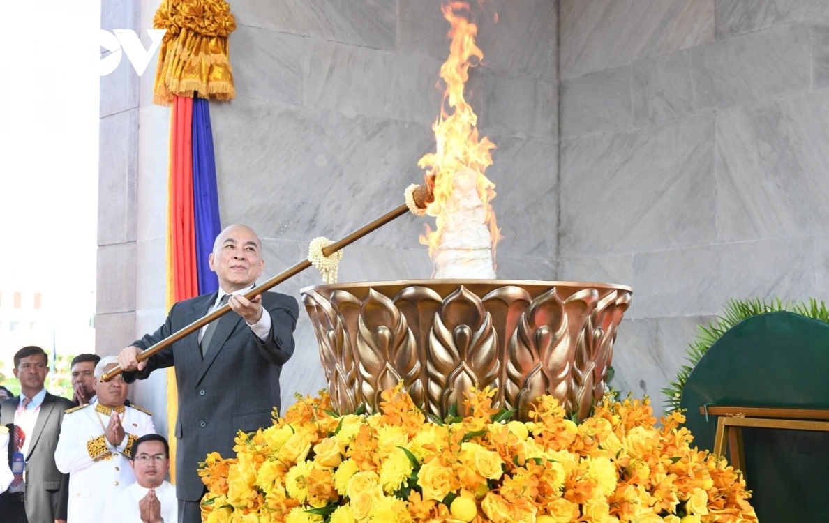 Seperti biasa setiap tahun, setelah upacara pengibaran bendera, Raja Norodom Sihamoni meletakkan karangan bunga untuk mengenang para pahlawan dan martir, serta menyalakan obor di Monumen Kemerdekaan di pusat kota Phnom Penh, yang melambangkan kemenangan, perdamaian, dan kemerdekaan penuh Kamboja. Raja juga memimpin upacara peninjauan pasukan, memberi selamat kepada pasukan Tentara Kerajaan Kamboja, dan menyambut para delegasi serta banyak warga Kamboja dan sahabat internasional yang menghadiri perayaan khidmat ini. Perayaan Hari Nasional ke-72 berlangsung dalam konteks Kamboja, di bawah kepemimpinan Raja Norodom Sihamoni, Partai Rakyat Kamboja, dan Pemerintahan Kerajaan Perdana Menteri Hun Manet untuk periode ke-7, telah mengatasi berbagai kesulitan dan tantangan di segala aspek untuk menjaga stabilitas dan pertumbuhan ekonomi. Perekonomian Kamboja diperkirakan masih akan mencapai tingkat pertumbuhan sekitar 5% pada tahun 2025.
