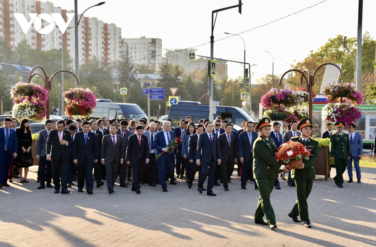 Setiba di Moskow, Ketua MN Tran Thanh Man mempersembahkan bunga di Tugu Monumen Presiden Ho Chi Minh, meletakkan karangan bunga di Tugu peringatan Martir Tak Dikenal di Tembok Kremlin, meletakkan karangan bunga di Tugu peringatan Martir Tak Dikenal Federasi Rusia di Ibu kota Moskow.
