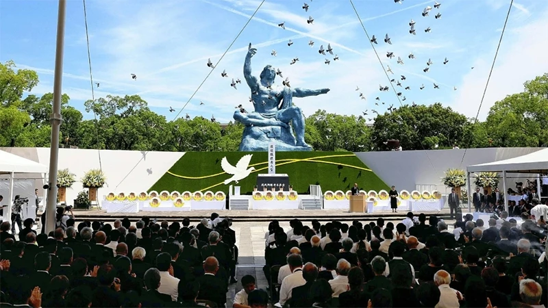 Pemerintahan Kota Nagasaki menyelenggarakan acara peringatan HUT ke-79 pengeboman atom oleh Amerika Serikat terhadap Kota ini (Foto: Japan Times) |