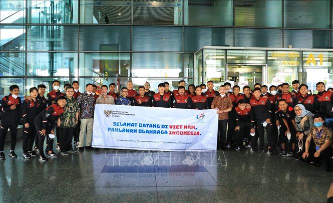 Para pemain sepak bola dan pelatih kesebelasan sepak bola putra U23 Indonesia berfoto bersama di bandara Noi Bai sebelum melanjutkan perjalanan ke Phu Tho, tanggal 3 Mei 2022. Foto:Tuan Anh/ VNA |