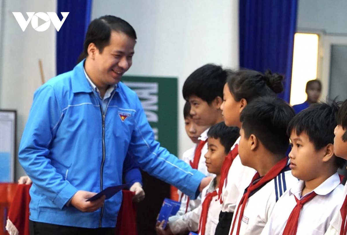 Ngo Van Cuong, Sekretaris Pengurus Besar Liga Pemuda Komunis Ho Chi Minh memberikan beasiswa kepada para pelajar (Foto: Khoa Diem/VOV) |