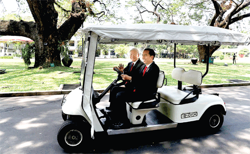 Presiden Joko Widodo mengendarai mobil listrik untuk mengangkut Sekjen Nguyen Phu Trong di Istana Bogor tahun 2017 (Foto:nhandan) |