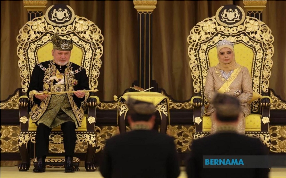 Raja Malaysia, Sultan Ibrahim dan Ratu Raja Zarith Sofiah pada upacara pelantikan. (Foto: Sumber Bernama) |