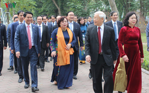 Pada hari yang sama, Sekjen Nguyen Phu Trong telah membakar hio di Tugu Monumen Raja Ly Thai To, Kuil Ngoc Son dan Tugu Monumen Raja Le Thai To.
