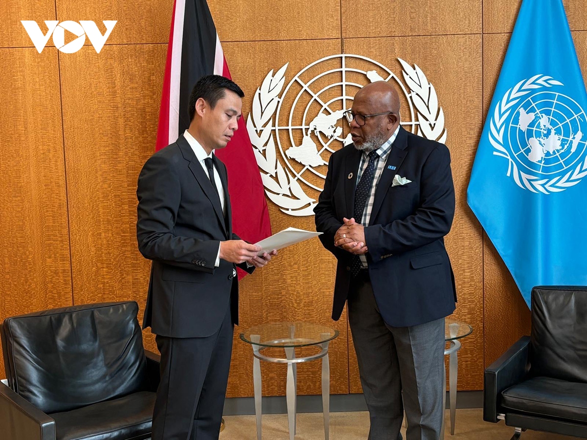 Ketua MU PBB, Dennis Francis dan Dubes Dang Hoang Giang (Foto: VOV) |