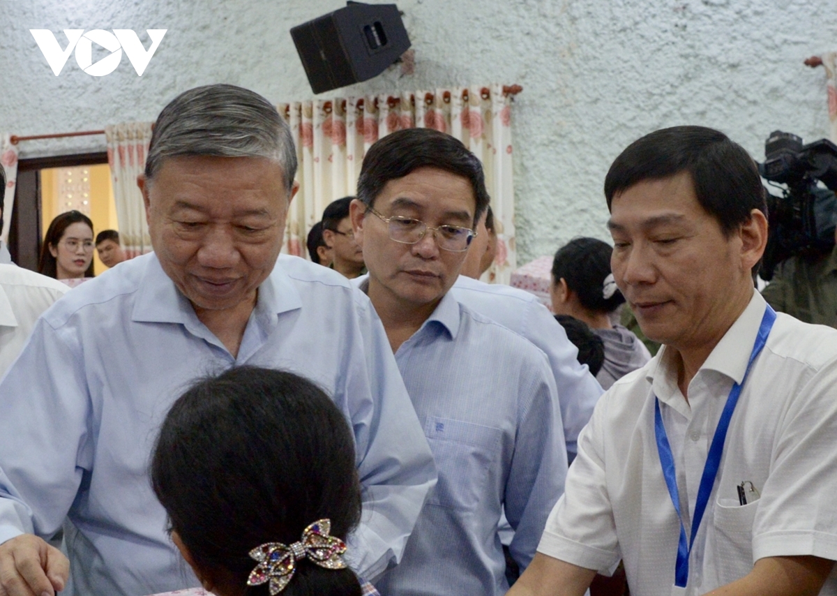 Ketika mengunjungi dan menyapa para keluarga di dusun Khuong Pho Dong, Kecamatan Quang Dien, Sekjen To Lam menekankan bahwa Partai, Negara dan warga seluruh negeri selalu berkiblat ke Vietnam Tengah dan Kota Hue dengan semangat “daun yang utuh membantu daun yang robek”, secara tepat waktu membantu dan berbagi kesulitan dengan masyarakat daerah banjir. Semua angkatan fokus mengatasi secara tepat waktu dampak bencana alam, melindungi keselamatan jiwa masyarakat.