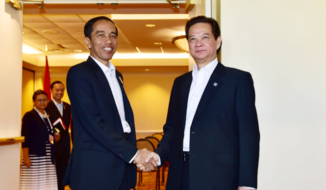 PM Vietnam, Nguyen Tan Dung menemui Presiden Indonesia, Joko Widodo (kiri) di sela-sela KTT ASEAN-AS
