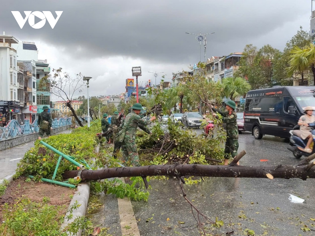 Para komandan dan prajurit dengan giat membersihkan pohon tumbang. Foto: VOV |