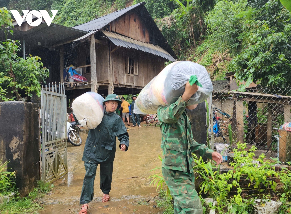 Angkatan bersenjata di Provinsi Son La membantu masyarakat mengungsi dari daerah yang berisiko terjadi tanah longsor. Foto: VOV |