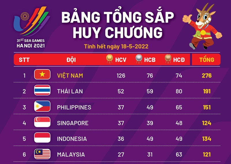 (VOVWORLD) - Hingga 18 Mei malam, hari pertandingan resmi ke-6 SEA Games ke-31, kontingen olahraga Vietnam telah menggondol 276 medali, di antaranya 126 medali emas, 76 medali perak, dan 74 medali perunggu, terus menjaga dengan mantap posisi teratas daftar klasemen.