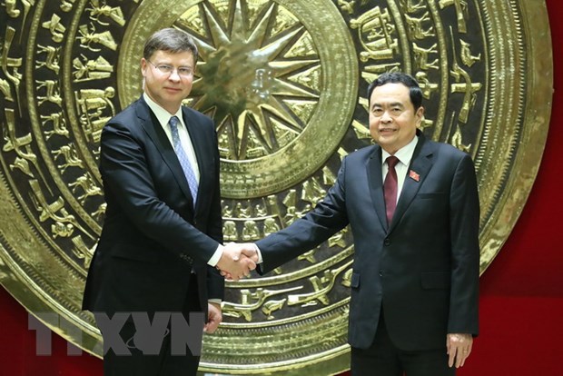 Wakil Harian Ketua MN Vietnam, Tran Thanh Man (kanan) dan Wakil Presiden Komisi Eropa, Valdis Dombrovski (Foto: Minh Duc/VNA) |
