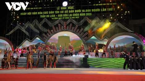 (VOVWORLD) - Dengan tema “Warna Budaya – Konvergensi dan Penyebaran”, Festival Budaya Berbagai Etnis dengan Jumlah Populasi kurang dari 10.000 orang dan Pekan Pariwisata Budaya Lai Chau tahun 2023 untuk pertama kalinya diadakan di Provinsi Lai Chau pada Jumat malam (3 November).