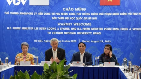 (VOVWORLD) - Perdana Menteri (PM) Vietnam, Pham Minh Chinh dan Istri serta PM Singapura, Lee Hsien Loong dan Istri, pada Hari Selasa (29 Agustus), telah mengunjungi Universitas Nasional Hanoi dan melakukan pertemuan dengan para mahasiswa sehubungan dengan kunjungan resminya di Vietnam dari tgl 27 hingga tgl 29 Agustus.