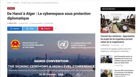 (VOVWORLD) - Media Aljazair menilai bahwa ibu kota Vietnam akan menjadi fokus diplomasi global ketika menjadi tempat berlangsungnya upacara penandatanganan Konvensi Perserikatan Bangsa-Bangsa (PBB) tentang Pencegahan dan Pemberantasan Kejahatan Siber (Konvensi Hanoi) pada 25-26 Oktober.