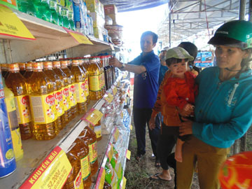 Kalau memasuki supermarket Fivimart di jalan Ly Thai To, kota Hanoi, para pelanggan bisa melihat berbagai macam jenis barang yang berasal dari dalam negeri misalnya hasil perikanan, bahan makanan, kue, gula-gula sampai barang-barang pakaian, perabot rumah tangga. Barang Vietnam telah menduduki hampir semua gerai dalam supermarket ini. Hal yang patut diperhatikan ialah banyak merk dagang Vietnam terkenal diletakkan di posisi-posisi menonjol dalam supermarket sehingga ada banyak pelanggan yang memilihnya. Diantara jumlah barang konsumsi di supermarket ini, jenis barang bahan makanan yang diproduksi di dalam negeri telah dipasarkan secara sangat kuat. Saudari Nguyen Thi Nga, pelanggang di kabupaten Hai Ba Trung, kota Hanoli memberitahukan: “Barang domestik sekarang menduduki lebih dari 90%, sedangkan barang asing lebih sedikit karena barang domestik yang harganya sedang, tapi kualitas juga sangat baik. Secara umum, keluarga saya, termasuk tetangga juga menggunakan barang domestik”.
