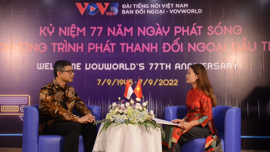 Duta Besar RI untuk Vietnam, Denny Abdi menjawab wawancara reporter VOV5 Huong Tra