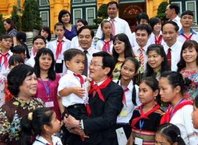 Presiden Vietnam Truong Tan Sang dalam pertemuan dengan Guru dan kaum pelajar .