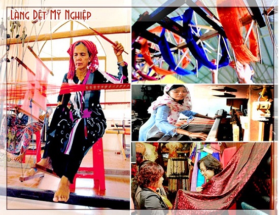 Kalau di desa-desa kerajinan menenun kain ikat yang lain, pekerjaan pokok dilakukan oleh para perempuan saja, tapi di Desa My Nghiep, hampir semua penenun di desa ini adalah pemuda-pemudi. Perempuan membuat benang, menenun kain, sedangkan para lelaki menggunting kain dan menjahit produk. Di daerah ini, selalu diselenggarakan Festival tentang produk-produk pertenunan kain ikat dari warga etnis Cham untuk diperkenalkan dan disosialisasikan kepada para pengunjung dari semua penjuru Tanah Air. Saudari Ham Thi Nhu Y, seorang artisan di Desa kerajinan menenun kain ikat My Nghiep, Provinsi Ninh Thuan memberitahukan: “Ada pasar di dalam dan luar negeri, produk di desa kami diekspor ke luar negeri, misalnya India, Thailand, Amerika Serikat dan sebagai-nya.. Di desa kami sekarang ini ada 300 kepala keluarga yang melakukan kerajinan menenun kain ikat. Keluarga saya melakukan kerjainan ini sudah beberapa generasi ini. Desa kami membentuk Koperasi kerajinan menenun kain ikat untuk menghimpun semua kepala keluarga yang melakukan kerajinan menenun kain ikat, semua orang menugasi tahapan-tahapan masing-masing …sehingga efektivitas-nya lebih baik”.