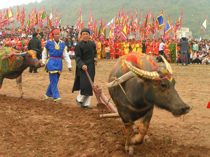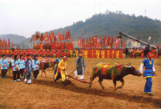 Pesta adat Membajak Sawah berlangsung pada tanggal 7 bulan pertama tahun Imlek saban tahun. Menurut buku “Sejarah Vietnam”, pada tahun 987, raja Le Dai Hanh telah tiba di kaki gunung Doi untuk melakukan pesta Membajak Sawah yang pertama kalinya dalam sejarah Vietnam, membuka satu halaman sejarah baru bagi peradaban padi sawah dan mengawali adat istiadat yang baik untuk diikuti oleh dinasti-dinasti di kemudian hari. Pada awal musim semi, raja melakukan ritual memuja untuk memohon cuaca yang baik, panenan yang baik dan membajak sawah sendiri, memulai satu masa tanam baru. Dengan sejarahnya selama ribuan tahun, pesta Membajak Sawah telah menjadi satu adat istiadat yang baik dan dilaksanakan secara hormat dan megah oleh dinasti-dinasti Ly, Tran, Le dan Nguyen.