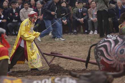 Aksentuasi dalam pesta ini ialah merekonstruksikan citra raja Le Dai Hanh melakukan pembajakan-pembajakan pertama dalam satu musim semi baru. Raja mengawali musim semi dengan pembajakan-pembajakan memanifestasikan rasa sulit diderita bersama, simpati dan berbagi kesulitan dengan rakyat, merangsang rakyat bekerja agar semua orang mendapat cukup sandang, cukup pangan, Tanah Air tenteram dan lain-lain. Justru oleh karena itu, ketika merekonstruksikan citra ini, Panitia Penyelenggara pesta juga harus mencari orang yang sesuai untuk memegang peran raja. Tran Dinh Tien, Kepala Jawatan Kebudayaan dan Informasi kabupaten Duy Tien, provinsi Ha Nam memberitahukan: “Bagi orang yang memegang peran raja, kami harus memilih orang yang mempunyai wajah yang serius dan punya langgam seperti raja. Orang-orang ini haruslah orang yang mempunyai banyak sumbangan, berhasil mempertahankan hubungan yang baik dengan rakyat di desa, kecamatan dan adalah orang yang pandai berproduksi”.