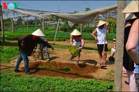 Mereka suka memotret dan mendengarkan perkenalan tentang cara menanam sayur yang khusus di daerah ini yang disampaikan oleh pemandunya. Ketika datang ke ladang keluarga saudari Le, seorang petani di desa Tra Que, para wisatawan dengan mata kepala sendiri melihat cara mencangkul tanah, menyebar ganggang, biji sayur sawi dan lain-lain. Philippe dengan antusias memegang cangkul dan mencangkul tanah di lahan yang luasnya kira-kira 3 meter persegi dengan bimbingan saudari Le. Tetesan-tetesan keringatnya mengalir di wajahnya, tapi Philip merasa antusias ketika langsung melakukan pekerjaan dari seorang petani. Dia mengatakan: “Saya sangat terkesan dengan teknik menanam sayur dengan biologi yang dilakukan kaum petani di sini, terutama ketika dapat ikut melakukan penanaman bersama dengan mereka. Semua gerak tidak mudah. Dan yang paling mengherankan ialah pupuk di sini diambil dari tumbuhan ganggang di sungai”.