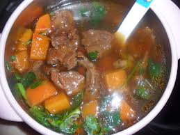 Bahannya terdiri dari: 500g daging sapi, dua ubi wortel, 5 ubi kentang, 80 gram saus tomat, satu buah tomat segar, 200ml miras merah atau miras putih, dua sendok bubuk ganyong, garam, vetsin dan lada.
