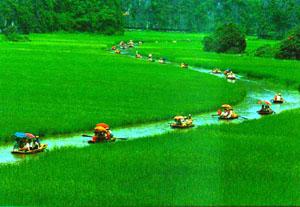 Tam Coc berarti ada tiga gua yaitu Gua pertama, gua kedua dan gua ketiga yang dibentuk oleh sungai Ngo Dong yang menerobos gunung. Di semua gua ini, kita bisa meraba stalaktit yang bermacam-macam bentuk-nya dari jutaan tahun lalu. Kalau datang ke Tam Coc, kendaraan satu-satunya ialah perahu, wisatawan bisa pergi di tengah-tengah lumbung yang sekitarnya ialah gunung batu yang syarat geografinya sangat sulit. Wisatawan juga bisa berperahu dan memandangi pemandangan yang puitis di dua tepian sungai Ngo Dong seperti Gua Thien Huong, Gua Tien dll… Saudari Thu Ha, seorang wisatawan mengatakan: “Saya baru saja melewati gua pertama dan dapat berbaur pada satu tata ruang yang eksotis dan satu anak sungai yang airnya sangat jernih dan biru. Di dua tepian sungai ialah sawah-sawah padi. Kami bisa membuat potret-potret yang sangat indah di sini. Biasanya, sangat takut akan air, tapi ketika duduk di perahu di sepanjang sungai ini dan dapat berperahu sendiri saya merasa sangat senang dan terkesan”.