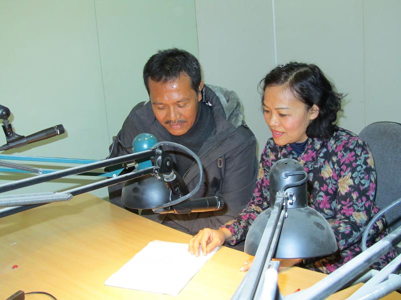 Penyiar siaran bahasa Indonesia mendampingi pendengar Hazairin R.Junep di kota Hanoi.