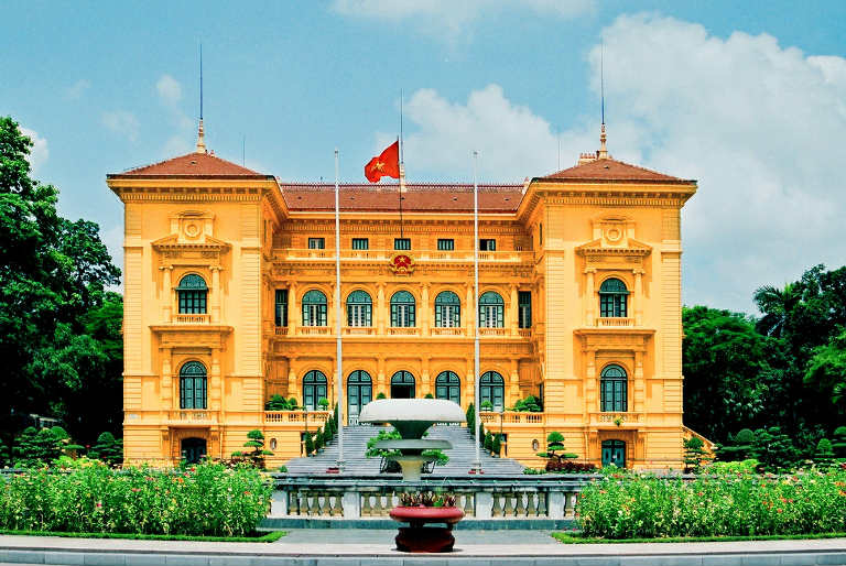 Ketika mengunjungi situs ini, kita bisa melihat Gedung Istana Presiden – yang dibangun dengan arsitektur ranaisans pada tahun-tahun awal abad XX (1900-1906) menurut perancangan arsitek Perancis keturunan Jerman, Lichten Fende. Pada masa yang dikuasi Kolonialis Perancis, gedung ini disebut sebagai Istana Gubernur Jenderal Indocina. Setelah perang perlawanan menentang kolonialis Perancis mencapai sukes dan Ibukota Ha Noi dibebaskan, gedung ini disebut sebagai Istana Presiden – tempat di mana Presiden Ho Chi Minh memimpin sidang-sidang Dewan Pemerintah untuk memutuskan masalah-masalah besar dan penting bagi Tanah Air, menyambut tamu internasional dan mengadakan pertemuan-pertemuan dengan wakil rakyat Vietnam.