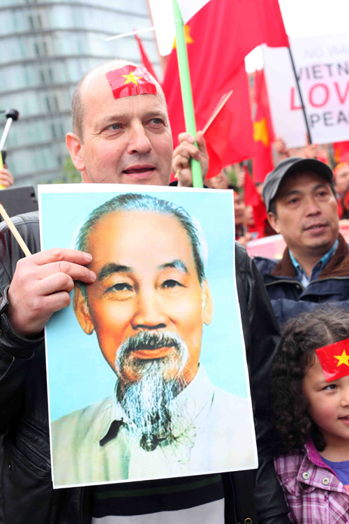 Sahabat -sahabat internasional menjunjung tinggi gambar Presiden Ho Chi Minh dalam pawai mendukung kedaulatan Vietnam di Laut Timur.