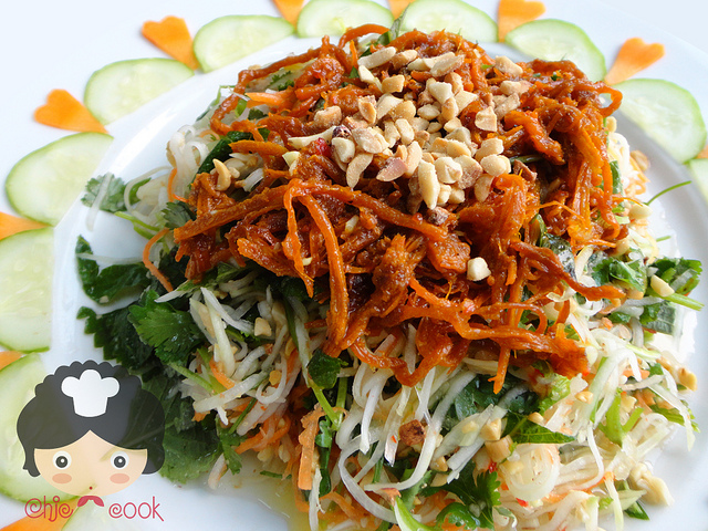 Cara pembuatan-nya sebagai berikut: pepaya dan wortel diiris- iris menjadi kecil. Semuanya direndam dalam air dingin. Bawang putih dan cabai diiris- iris menjadi kecil juga. Air jeruk nipis dicampur dengan sedikit gula, vetsin dan dicampur dengan bawang putih dan cabai. Pepaya dan wortel yang direndam dalam air dingin, tadi dambil dan dikeringkan, kemudian dimadukkan ke dalam satu mangkok besar. Setelah itu menyebarkan sayur wangi yang diiris-iris kecil, air campuran bawang putih dan cabai ke mangkok itu, akhirnya mencampurkannya dengan daging sapi. Nah, marilah kita bersama- sama mencicipi masakan salad pepaya yang enak ini .