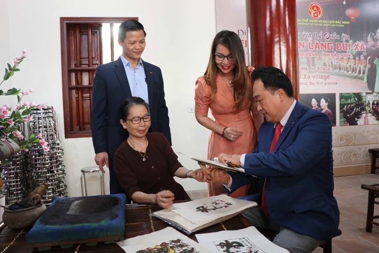 Seniman membimbing para tamu internasional membuat lukisan rakyat Dong Ho (Foto: dangcongsan.vn) |