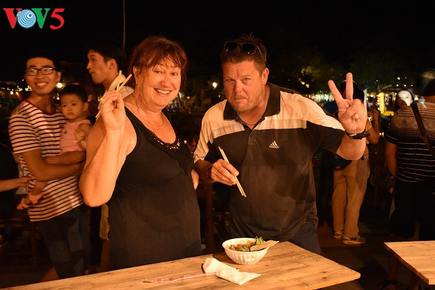 Para wisatawan sangat interesan ketika datang di Kota Hoi An dan menikmati masakan cao lau yang khas. |