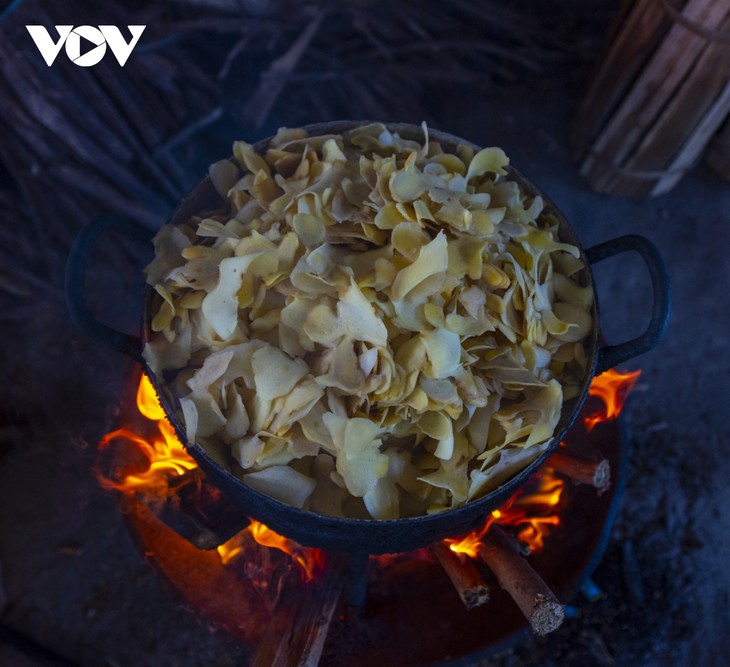 Setelah itu, jahe direbus dalam air mendidih dan dikeringkan sebelum dibuat menjadi manisan. Harus menggunakan arang kayu untuk membuat manisan jahe, aduk rata agar irisan jahe tidak saling menempel. Manisan jahe yang paling harum adalah tahap ini.