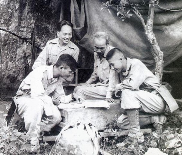 Presiden Ho Chi Minh, Jenderal Vo Nguyen Giap, dan Komandan Resimen Thai Dung, Komandan Batalyon Dung Ma sedang mempelajari peta operasional Operasi Perbatasan (1950). |