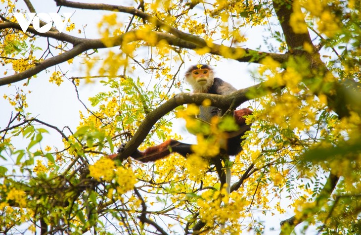 Momen lutung bergerak melewati pohon bunga "Lim xẹt" kuning yang sedang bermekaran selalu menarik perhatian orang-orang ketika datang ke sini.
