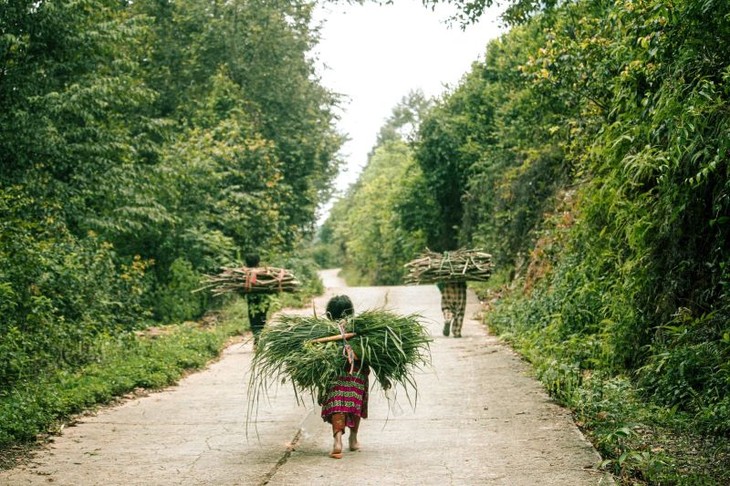 Anak-anak membawa rumput segar dan kayu bakar kering ke desa. (Foto: vietnamnet.vn)