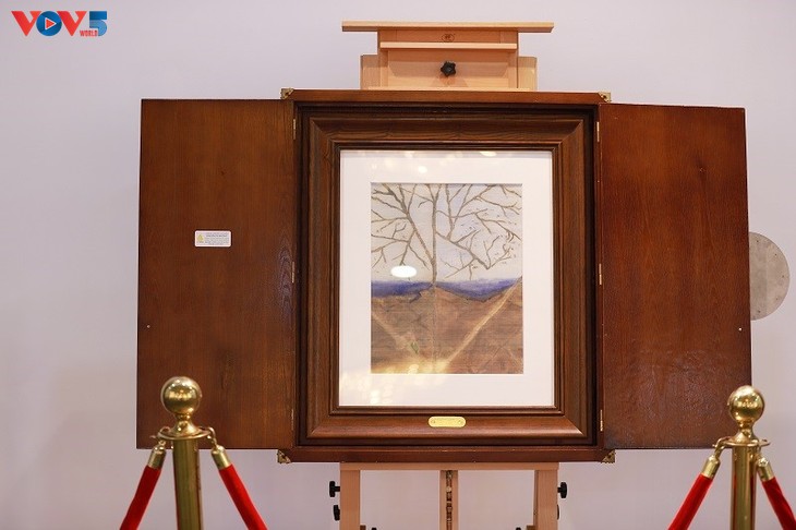 Ketika mengunjungi pameran, selain lukisan tentang bunga teratai, para pengunjung juga bisa mengagumi lukisan asli "Sampul Masa Depan" karya pelukis Kim Duc. Karya tersebut terkenal di seluruh dunia karena pesannya yang kuat tentang lingkungan dan perubahan iklim. "Sampul Masa Depan" dipilih sebagai hadiah yang bermakna pada Hari Raya Waisak 2019 yang terkenal di dunia pada tahun 2019. (Foto: Koran Hukum dan Sosial)