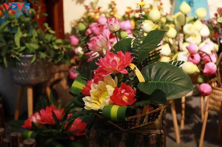 Diselingi dengan bunga teratai segar adalah keranjang bunga teratai yang dipangkas oleh pelukis Kim Duc dari buahan dan sayuran.