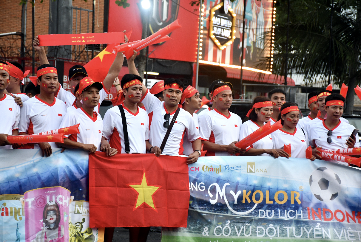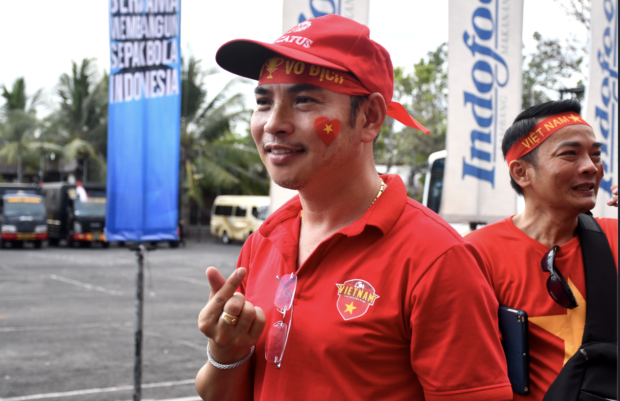 | Para pemuda Vietnam yang sedang kuliah di Jakarta juga datang ke Bali untuk mendukung timnas VIetnam |