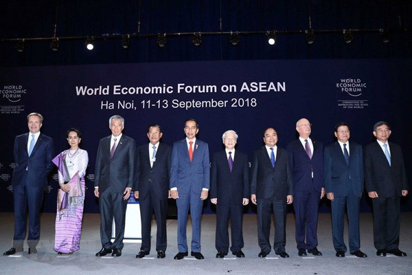 Sekjen Komite Senral Partai Komunis Vietnam (KS PKV), Presiden Nguyen Phu Trong, PM Nguyen Xuan Phuc, Presiden pendiri Konferensi Forum Ekonomi Dunia tentang ASEAN (WEF – ASEAN), Klaus Schwab (ketika dari kanan) dan para Kepala delegasi peserta Konferensi WEF tahun 2018 berfoto bersama. Sebagai negara tuan rumah, Vietnam telah membina konektivitas tentang ide, pembaruan dan kreativitas antara ASEAN dan WEF.